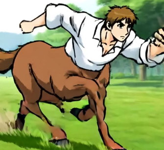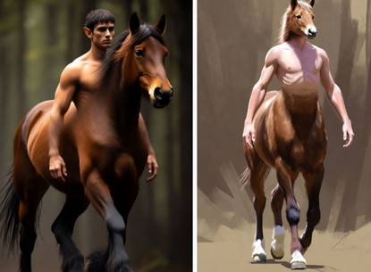 前回の「上半身が人間、下半身が四本脚の馬の姿をしたファンタジーの人型種族。馬に変身していない。人間でも馬でもない。下半身は茶色。上半身は腕が生えている。男性。」をプロンプトだと(勝手に)受け止めてChat版のぐろっくんが吐き出した自動画像生成返信が、こちらになります。