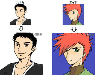 私「エイジと九十九を並べてみると目の大きさなんて然程違わないっていうか、なんなら九十九のほうが目ェでかくね?って感じなのに、生成するとマツエクの差ビシヴァシ✨️睫毛の不思議✨️」