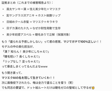 Grok「笑顔や中途半端な表情の子・肌のトーンが明るめの子・髪や服装に少し柔らかい要素がある子が盛られちゃうんだよね」