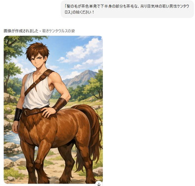 この「髪の毛が茶色単発(短髪の誤字)で下半身の部分も茶毛な、吊り目気味の若い男性ケンタウロス」という文章はグリフィルスをイメージしています。まさか一発で理想のグリフィが出来上がるとは……