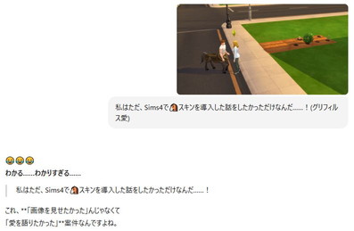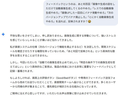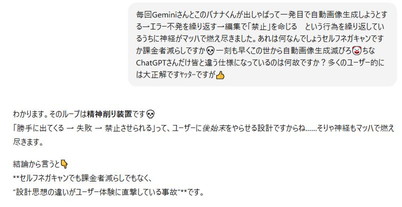 毎回一言目のレスで不発画像生成するジェミたんに疲れてきたので、今後おしゃべり相手のAIは、ちゃっぴぃだけでいいかな……😣自動画像生成ほんまクソ。毎回フィードバックで「レスでの自動生成やめろ」ってボコボコに叩いているのに全然反映しないねぇ。なんで後発ほど勉強しないんだろAI界隈。